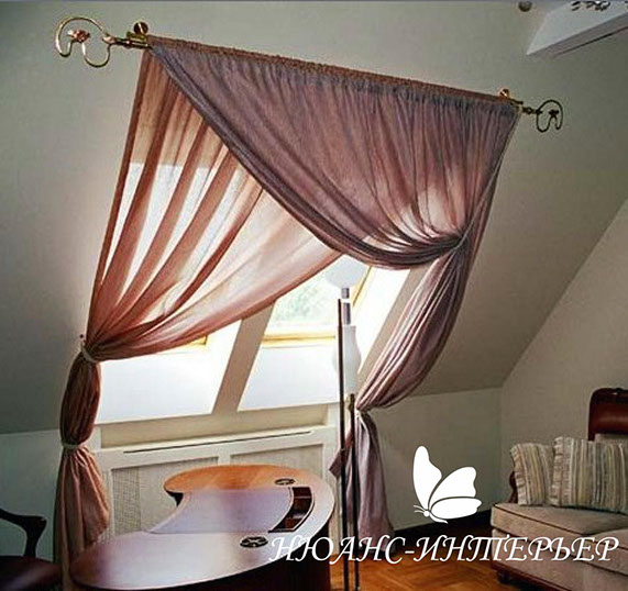 Декор окон нестандартной формы – не простое, но интересное занятие. Грамотное оформление окна или дверного проема сложной конфигурации может стать настоящим украшением Вашего дома или офиса. Нужно определиться, какую функцию будут выполнять шторы: защищать от посторонних глаз, солнечного света, являться исключительно декоративным элементом, или, чаще всего, совмещать первое и второе.